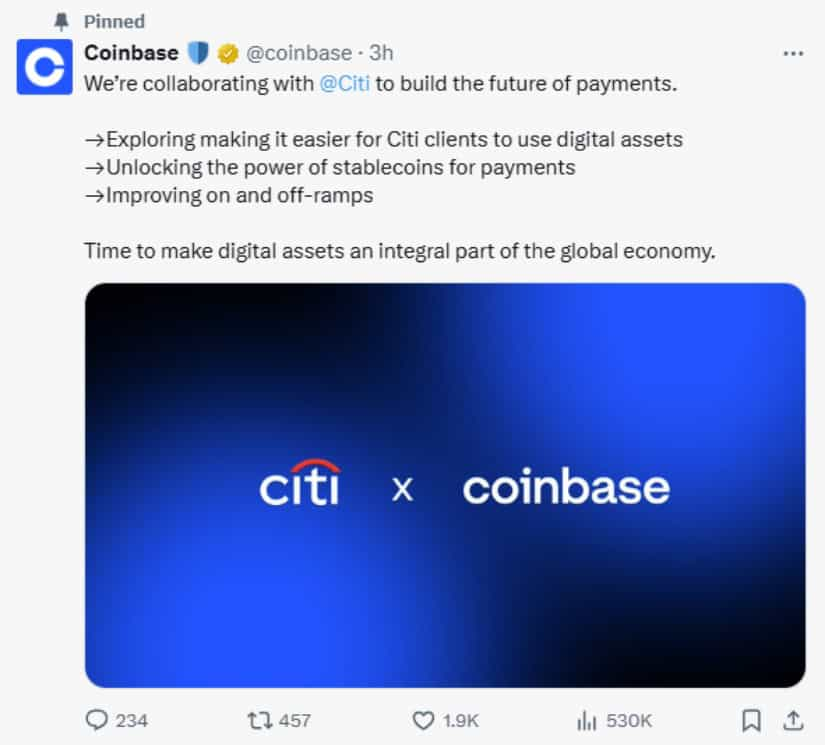 Citi has partnered with Coinbase to create digital asset payment solutions for its institutional clients. The collaboration is part of Citi's larger strategy to offer 24/7 digital money solutions, which already includes Citi Token Services and USD Clearing across its vast network. Citi plans to further expand its digital asset offerings by launching native crypto custody services for assets like Bitcoin and Ethereum in 2026.